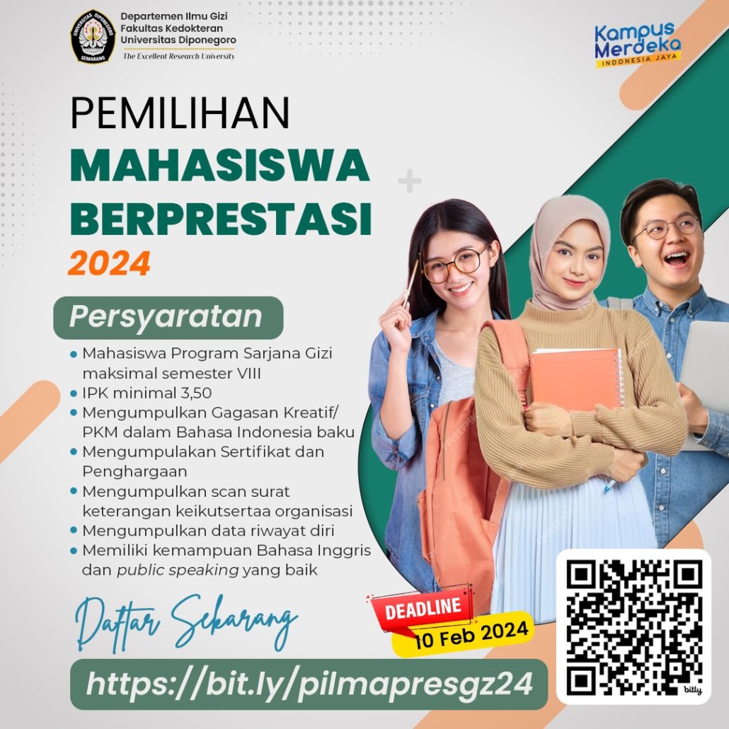 Dalam rangka mempersiapkan mahasiswa berprestasi Departemen Ilmu Gizi, kami mengundang semua mahasiswa yang memenuhi persyaratan berikut untuk mendaftar Pemilihan Mahasiswa Berprestasi 2024: