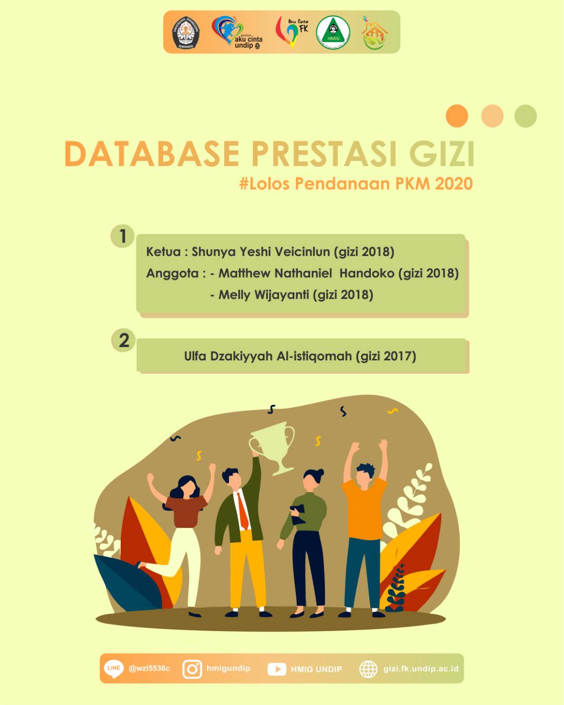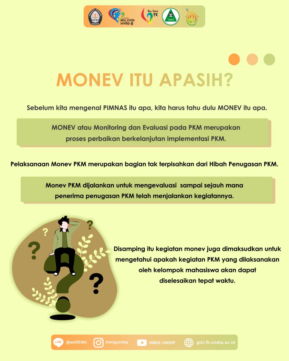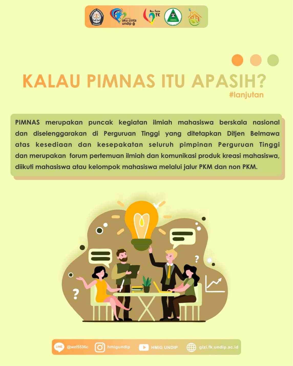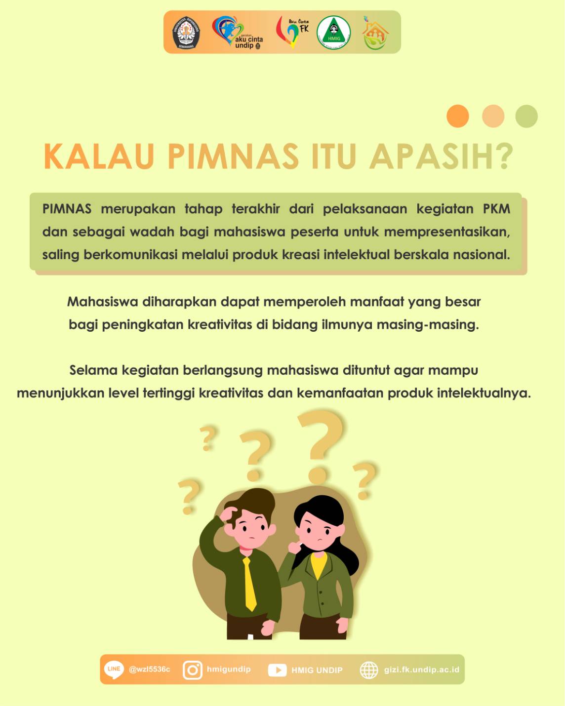 Sudah masuk tahun ajaran baru nih, selamat datang para Mahasiswa Gizi FK Undip, baik yang lama maupun yang baru! Pernah dengar PIMNAS kan? Belum? Ini acara paling bergengsi di dunia ilmiah mahasiswa loh. Kuy dibaca infografisnya biar makin tahu! Oh ya, kalau ada pertanyaan mengenai PKM di Gizi Undip, sampaikan melalui CP dibawah ya! Bagi pertanyaan terpilih berkesempatan untuk diangkat di post berikutnya. Semangat!