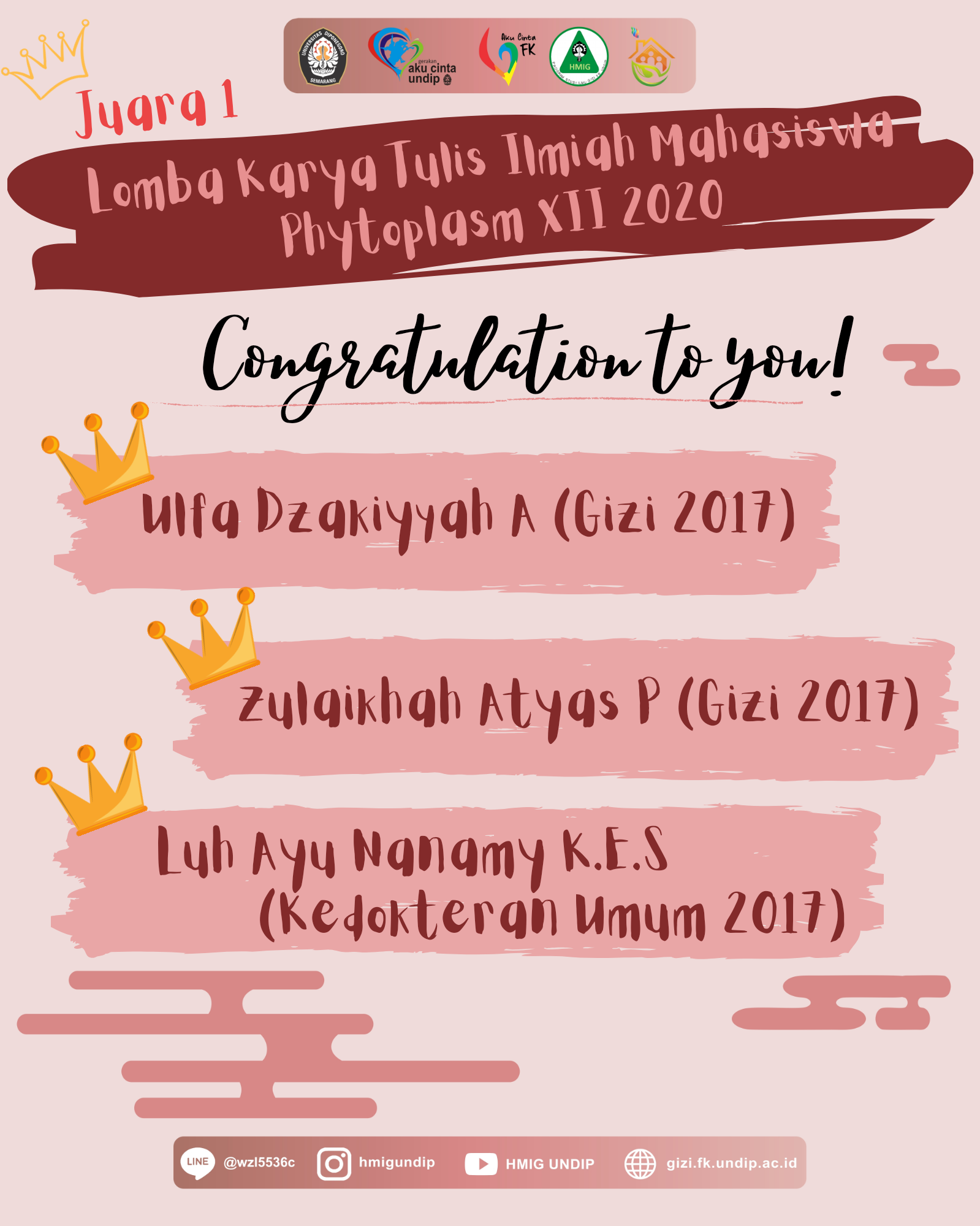 Kabar membanggakan datang dari mahasiswa Gizi atas perolehan Juara 1 lomba KTI Phytoplasm XII yang diselenggarakan oleh Himpunan Mahasiswa Farmasi Fakultas Kedokteran Universitas Tanjungpura ✨